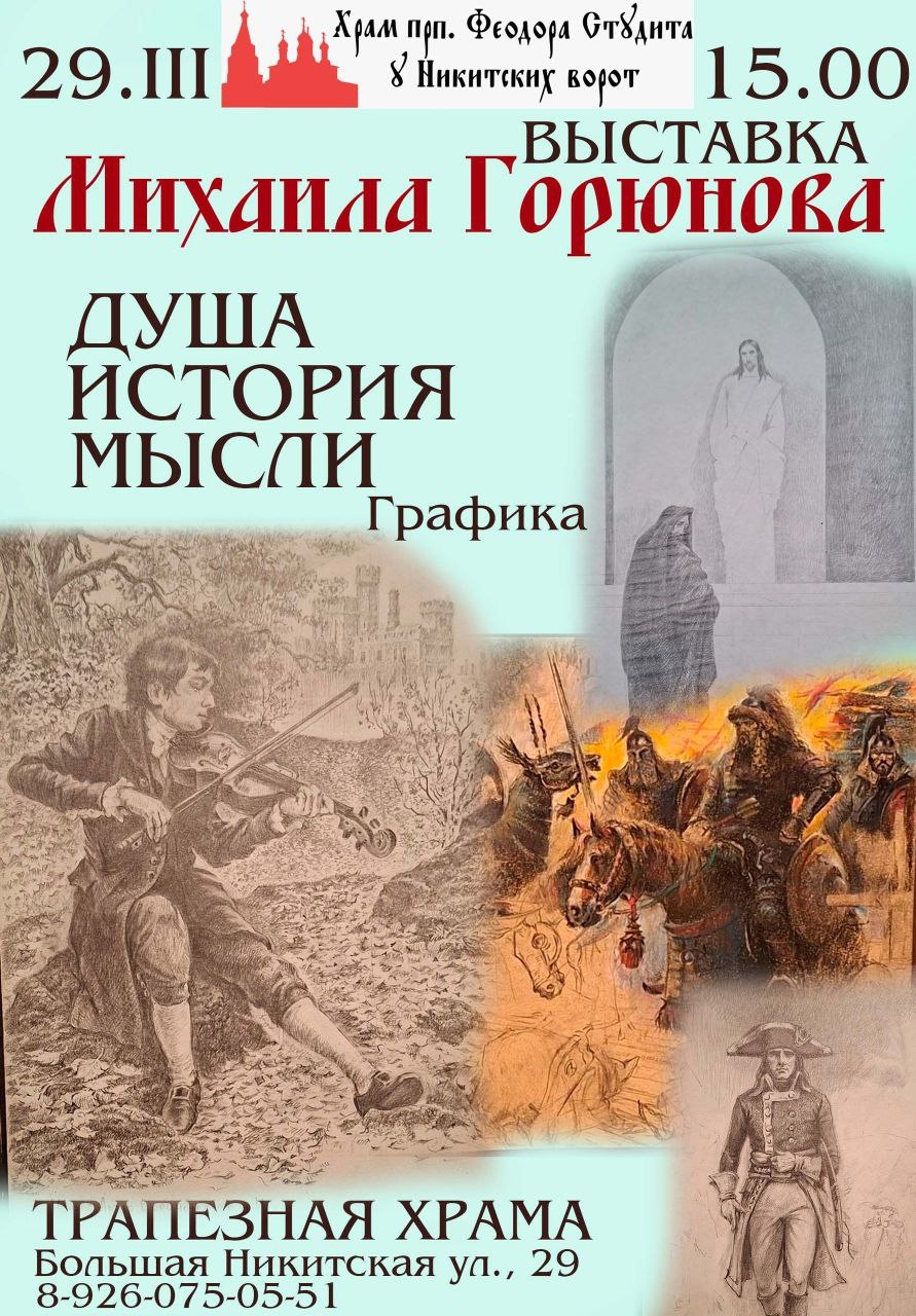 В небольшой Трапезной храма Преподобного Феодора Студита, играющей роль галереи храма и Культурного центра «АРТ’ЭРИА», временно не имеющего своего помещения, Михаилу выставиться оказалось драгоценно и почетно. Значительная история древнего храма, связанного неразрывно с историей России, ее царской династией Романовых, с великим Святым Преподобным Феодором Студитом, покровителем иконописцев и всех художников, с именем генералиссимуса Александра Васильевича Суворова, по преданию не только бывшего прихожанином нашего храма, но даже певшего тут на клиросе – все это очень дорого и ценно именно для этого Художника, а для нас почетно присутствие его 25 картин в стенах именно этого храма. Знаменателен тот факт, что на этой выставке общественность впервые увидит новую картину Михаила Горюнова — «ремейк» знаменитого «Перехода Суворова через Альпы» Сурикова! Сейчас, в ожидании канонизации великого российского полководца, не потерпевшего ни единого поражения, которой мы все чаем и ждем, особенно важна первая презентация эпического произведения, посвященного Суворову – дела рук выдающегося, не слышащего обычным слухом, Мастера Михаила Горюнова. Поздравляем всех с этим ярким событием!
